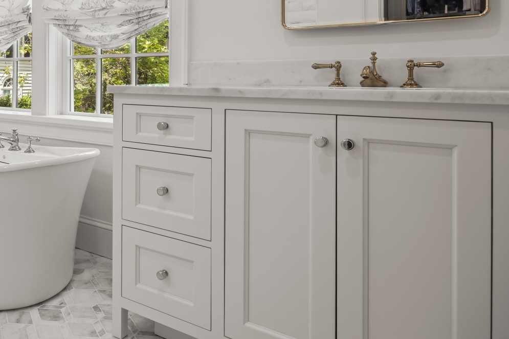 Designed for the couple of the house, this master bath design is anchored by a standing soaking tub and flanked by a matching pair of vanities. Specified with Wood-Mode’s Burlington Recessed Inset door style and finished in Nordic White, each vanity has been fitted with a marble slab top, coordinating with the...