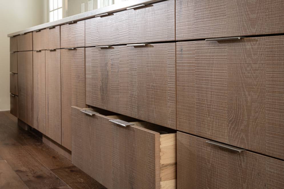 Preparing their home of 30 years to be their forever home, this builder and interior designer couple took up a remodel that would allow them to age-in-place. Already living on one floor, the homeowners removed several walls to create this updated open plan modern, minimal look with clean lines. A fan of the designs of fellow designers Axel Vervoordt, Ilse Crawford and John Saldino, the homeowner worked with her Wood-Mode kitchen designer to blend the inspiration of scale, textures and the ‘old and new’ into her new kitchen by selecting Milan doors in Iron Gray and Vanguard Plus doors in a custom matte finish. The addition of the stone-like marble countertop invokes a balance of modernity with sustainability.