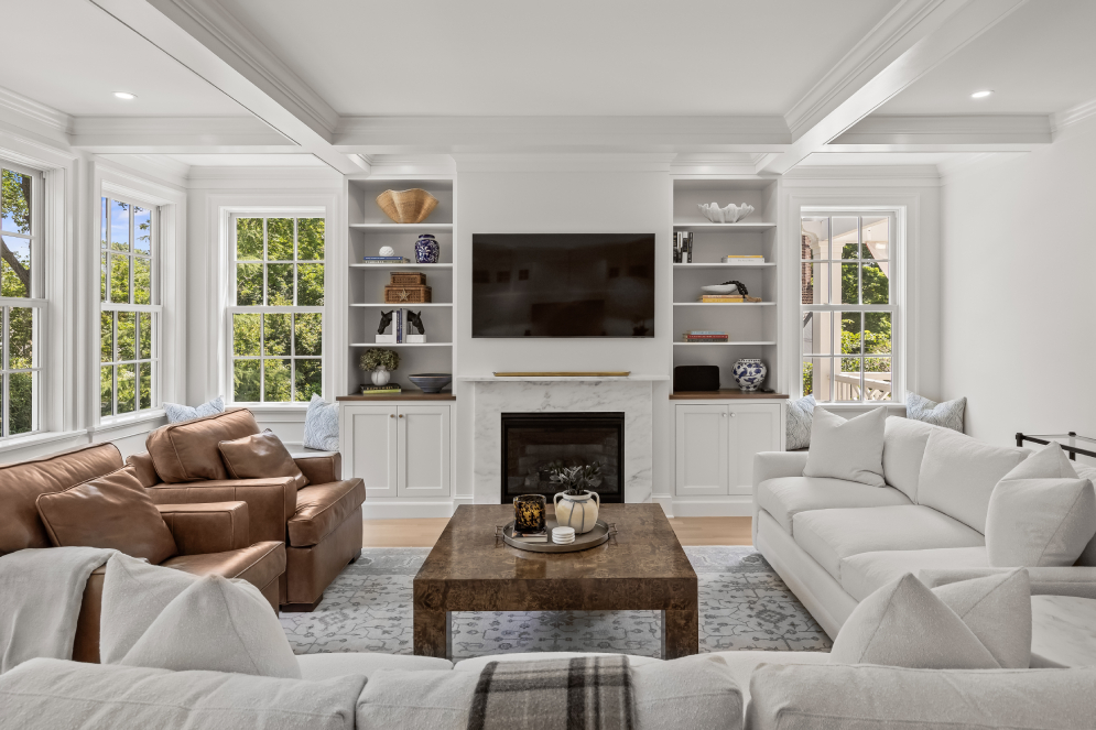 Part of a complete home transformation, the family desired an open plan living space and kitchen area that would allow them to spend more time together while cooking. The designer situated the main wall and seating area at a straight line from the kitchen area, providing an uninhibited view to those sitting or television viewing. The built-in Pasadena Recessed door style cabinetry with Walnut countertops and shelving above are finished in Alpine White, flanked by two custom seating areas, and the fireplace in the center of the wall creates options for cozy seating throughout the room.