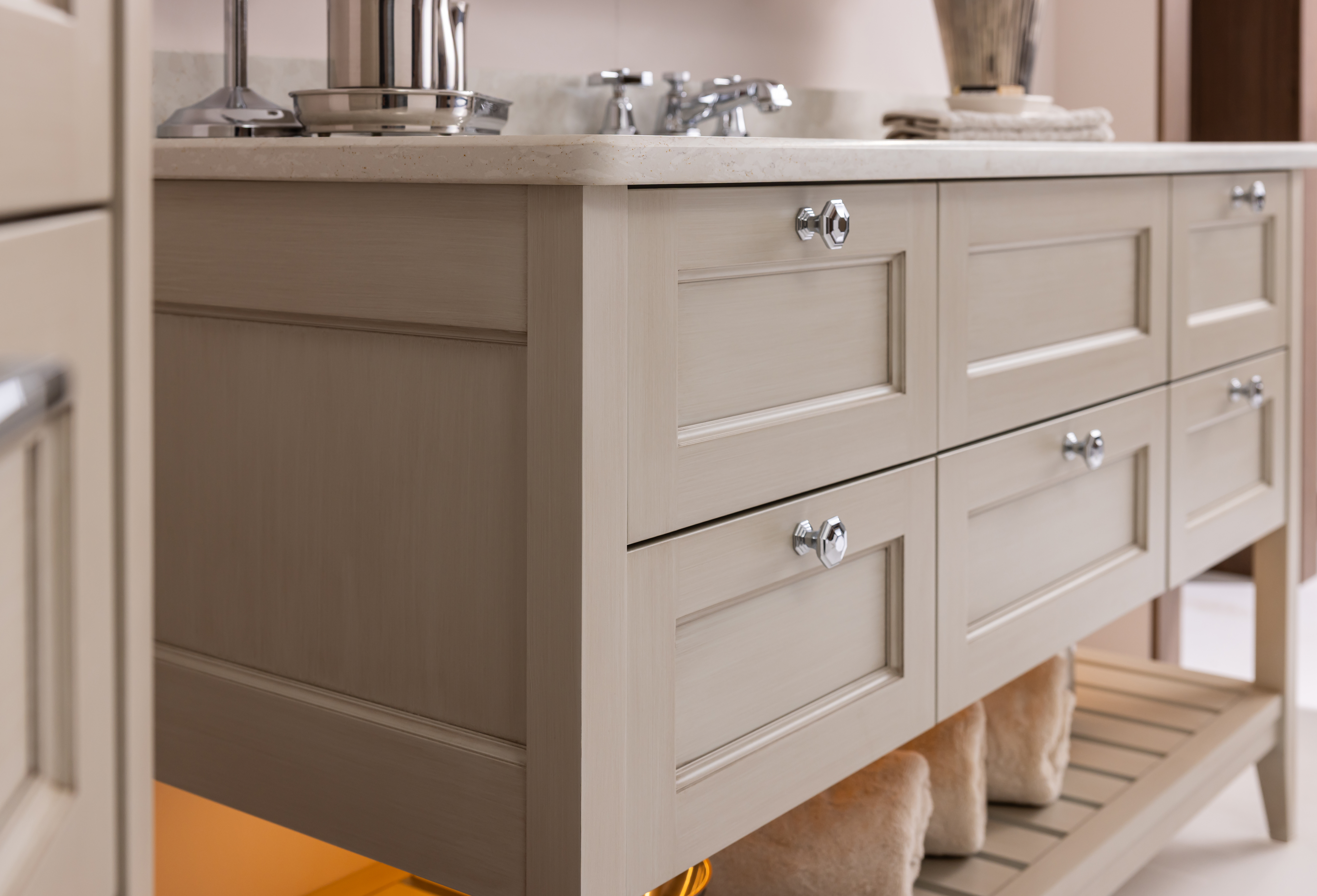 - Chateau – A transitional approach with tapered leg detail and Craftsman-esque molding. This vanity design includes the option for lower shelf storage.