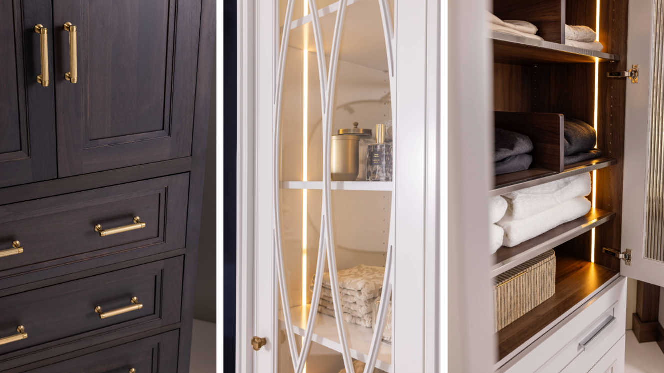 - Armoires, Dressers and High Boys – Moving deeper into the primary suite, customers can now outfit a bedroom or luxury closet with armoires, dressers and high boys designed to house clothing and accessories. These free-standing furniture pieces offer multiple in-drawer organizational options such as drawer dividers, shelf pull-outs, dual-tiered drawers and lined jewelry drawers. Dressers will include a matching wood countertop surface unless another material is specified.