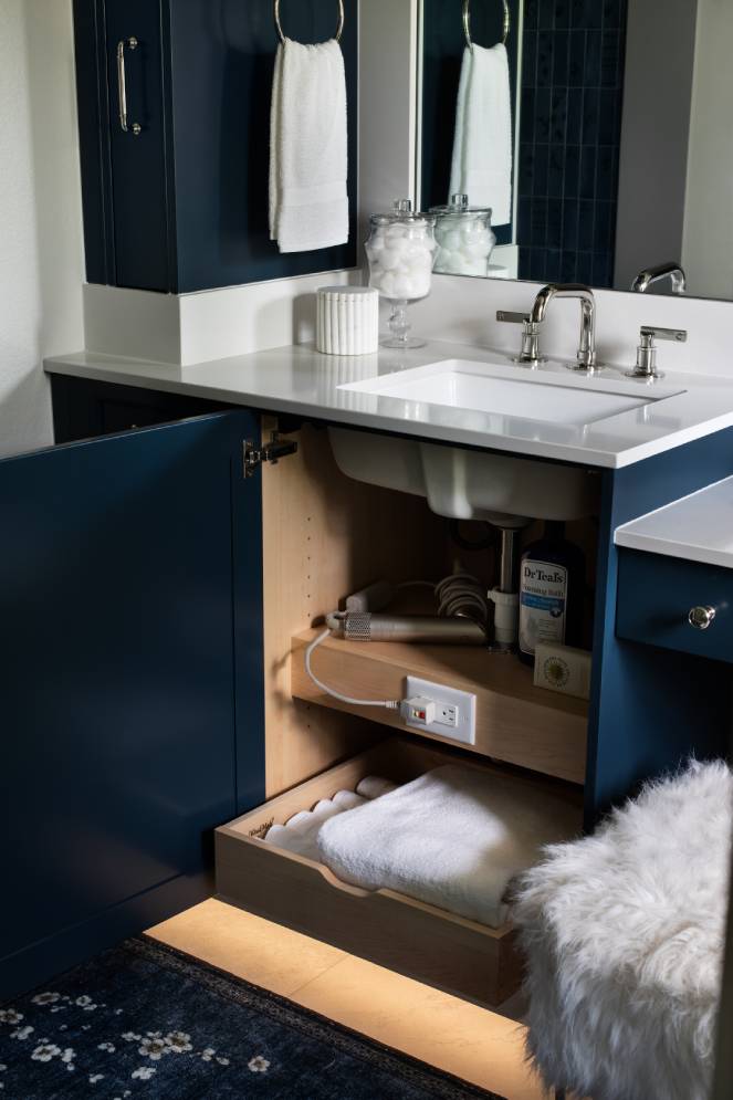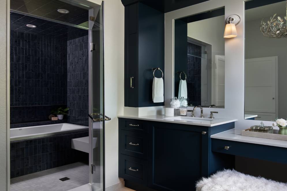 Rich and sophisticated are just a few words that easily describe this master bath. The Deep Aegean blue finish grounds the space with a sense of luxury, while the clean lines of the Edgemont recessed door style maintain a timeless, transitional appeal. The vanity area is enhanced with shelf valance lighting and a plush seating nook where a Custom Vanity Pull-Out provides convenient access to everyday items within arm’s reach, and roll-out storage drawers below keep fresh towels close at hand. Crown molding along the top and bottom of the cabinetry provides an elegant finishing touch, while toekick lighting creates ambiance and ease to see at night. Paired with the adjoining shower and tub clad in dark, textural tile, the design strikes a perfect balance between bold character and practical everyday usability, transforming the bathroom into a calming yet highly efficient retreat.