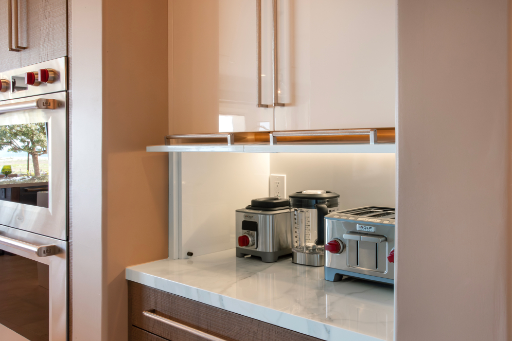 The homeowners asked the designer of this kitchen to create a larger, modern space that would “entertain a crowd.” A light color palette featuring Vanguard MDF in Nordic White was selected to brighten up the space and reflect the coastal view just outside the kitchen windows. The previous space underutilized the center of the room, and the decision to include two islands created a viable space for seating for guests. To create this space, however, the designer was challenged to remove a walk-in pantry and add a large steel beam. To offset the white and create dimension, Vanguard Plus in a Matte Foundry finish on rough sawn euro oak veneer was used for the island bases and then wrapped in the same porcelain material used on the backsplashes. And floor-to-ceiling wall cabinets more than made the storage space, packed with organizational extras like an appliance garage to keep countertops clear, swing-out spice rack within easy reach of the stove, and tall pull-out pantries to house cookware and cleaning supplies.