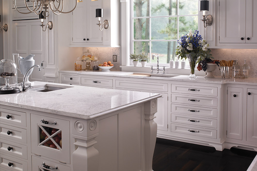 Inspired by classic Georgian architecture, elegant white cabinetry contrasts with the dark floors and hood. Dual islands and a wall of tall pantry and china storage provide functional efficiency.
