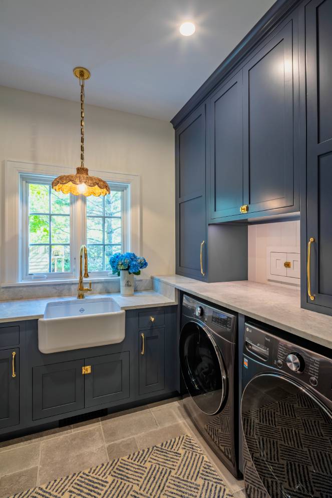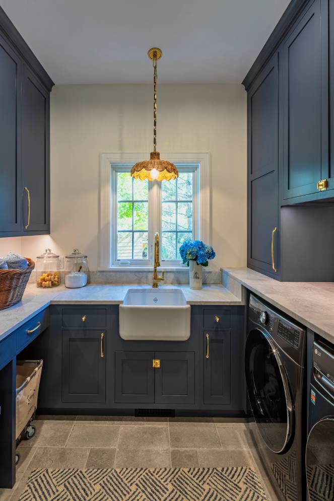 The laundry room features a large ceramic farm sink flanked by cabinets of Navy in the Rockport Recessed Inset door style. Some of the cabinetry conceals a utility storage closet with lots of additional organizational features behind the doors. Hideaway nooks were incorporated for laundry carts to keep them neatly tucked away when not being used. Ample counter space was important for the convenience of folding clothes, as well as for storage of extra baskets and detergents.
