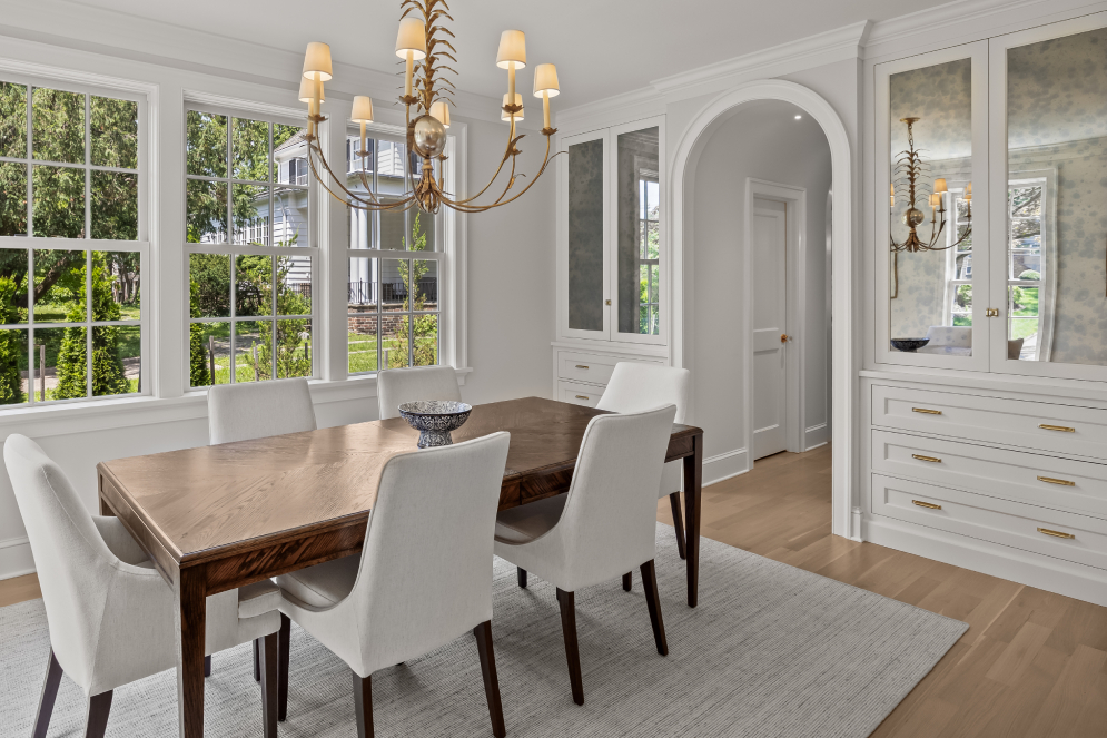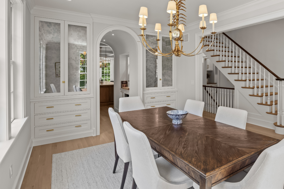 Part of a whole home renovation, this dining room makes the most of its small footprint. Located just off the kitchen, the dining room is accessed via a curved passthrough archway that hides a wet bar. Emerging from the passageway and into the room, built in storage space to accommodate crystal and China can be found on either side. Tucked behind built in cabinets designed with Pasadena Recessed door style finished in Nordic White and Rainbow Close antique mirror inserts with Brushed Golden Brass hardware. Two walls of windows allow natural light to fill the space and pour onto the dark Walnut dining table, creating a warming central focal point.