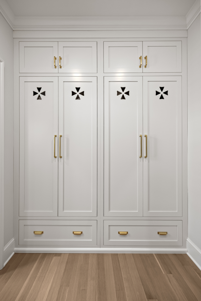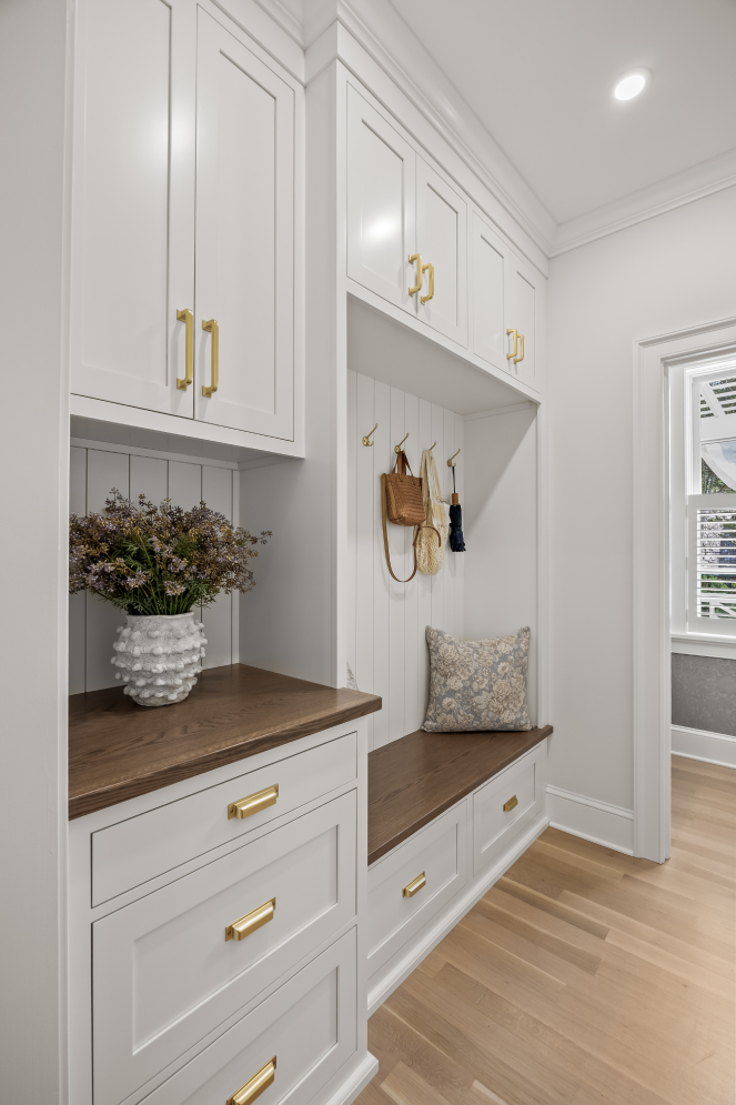 As part of this whole home renovation, the homeowners desired to have living spaces that brought the family together and also allowed them private space while creating a natural flow from the front door and throughout. This continuation of space does just that while showcasing the best of Wood-Mode’s custom capabilities. Just inside the home’s entrance, a mudroom area provides seating for the family to sit and remove shoes, and cabinets and shelving to store coats and bags. In the foyer, an inset wall cabinet with integrated lighting provides a place to safely showcase art and precious family heirlooms. And just a few steps down the hall finds a warm, inviting nook lined with bookshelves and a window. All of the home’s seating and storage areas are constructed of a combination of Wood-Mode’s Pasadena Recessed and Rockport Recessed door styles, both finished in Nordic White, and complimented with Walnut seat tops and cabinet back panels.