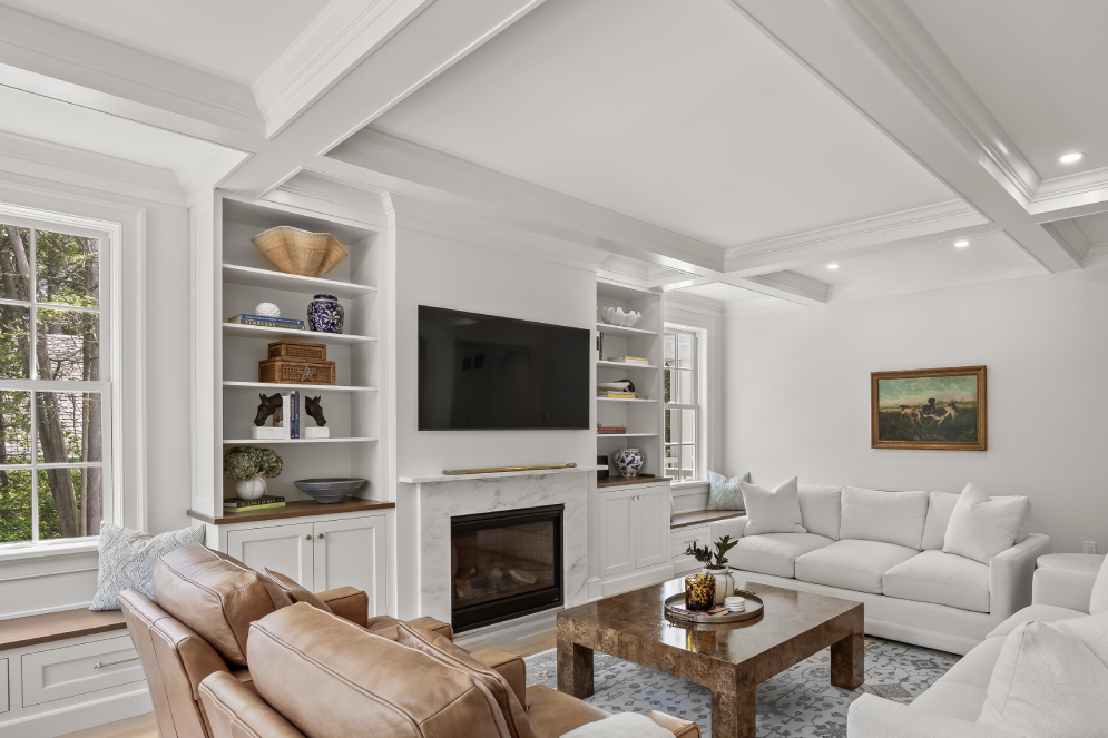 Part of a complete home transformation, the family desired an open plan living space and kitchen area that would allow them to spend more time together while cooking. The designer situated the main wall and seating area at a straight line from the kitchen area, providing an uninhibited view to those sitting or television viewing. The built-in Pasadena Recessed door style cabinetry with Walnut countertops and shelving above are finished in Alpine White, flanked by two custom seating areas, and the fireplace in the center of the wall creates options for cozy seating throughout the room.