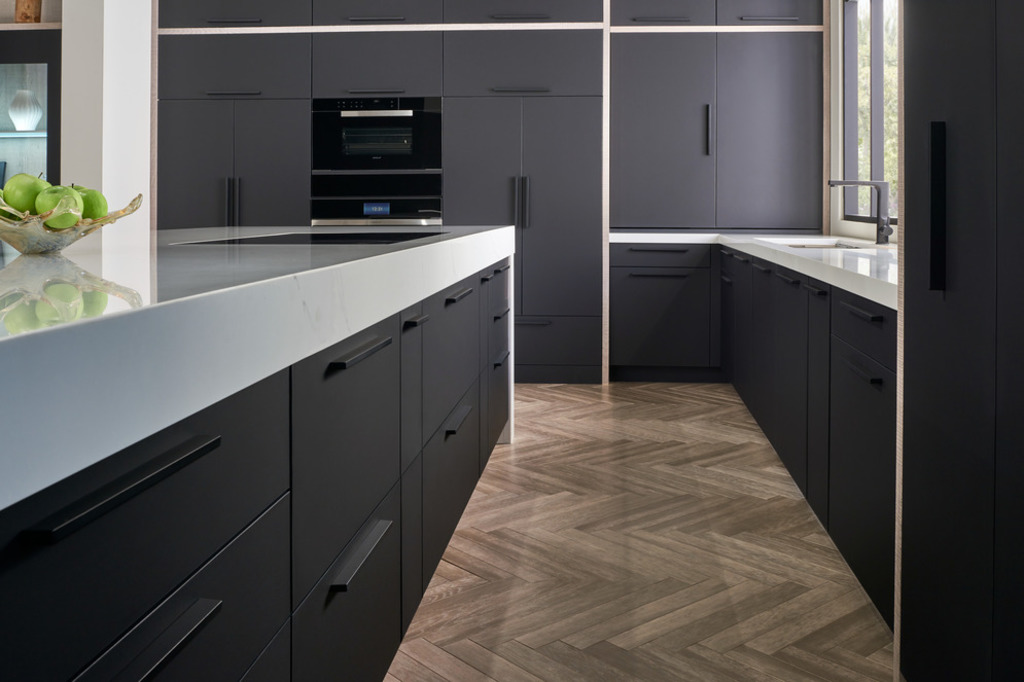 Taking its cue from fashion, the Tuxedo Kitchen emphasizes quality and attention to detail to establish its tailored appearance. Stylish and smart storage solutions keep the space uncluttered and countertops clear. Not only does this free up space but it also allows each element within the design to stand out in its own beauty. Patterns in countertops and details in cabinet doors transcend their purpose for functionality and enhance the ambience of the space.