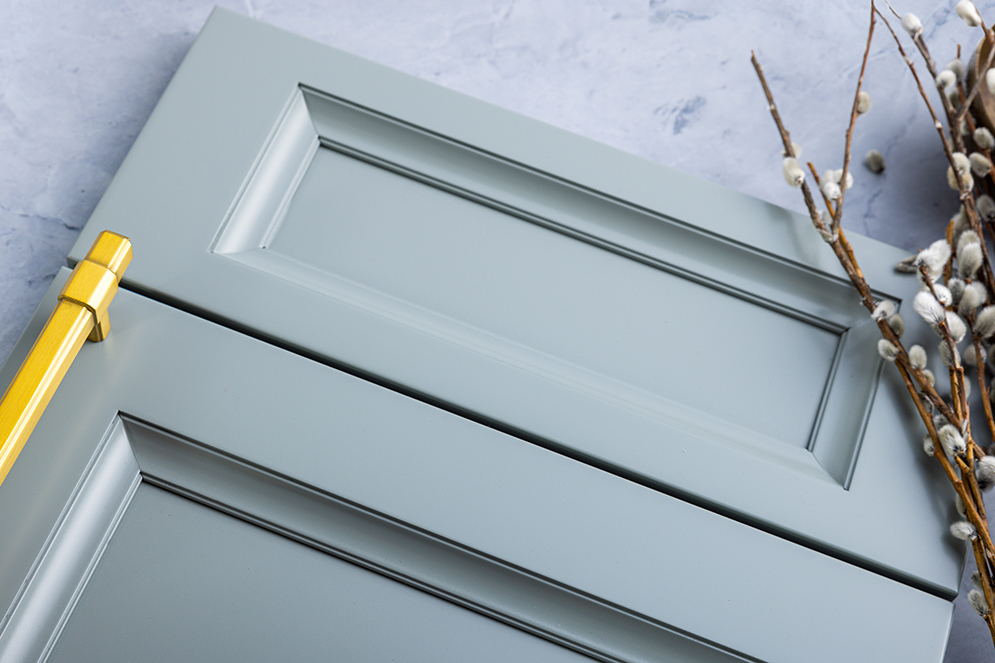 Before introducing accent items, start with a clean color palette on perimeter cabinets to unify the room. Specify cabinet finishes with minimal undertones and matte or semi-gloss finishes. Pale Spring is an inspiring shade that appears nearly gray in brighter light, then takes on a greener tone as the room dims. This inherent nuance creates an interesting yet subdued backdrop that compliments a variety of colors and patterns. Finish the foundation with a simplified cabinet profile to create a streamlined appearance that can be adorned with intricate hardware in unexpected finishes.