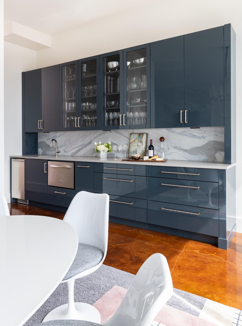 A stylish bar design incorporates both space to display special items and room to conceal those you would prefer to keep out of sight. Custom cabinetry provides unmatched storage solutions designed to fit your intended use of space. Open shelving or glass-front cabinet doors can showcase glassware and top shelf liquors. Metal rod inserts provide in-drawer storage for bottles while adding protection between glass vessels. Build wine racks with visible access or opt for a bi-pass door that enables you to tuck them away when the bar is not in use. Be sure to reserve space for storing tools and consider the location of any specialty items such a a blender or frozen drink machine that can be stored within a built-in appliance garage.